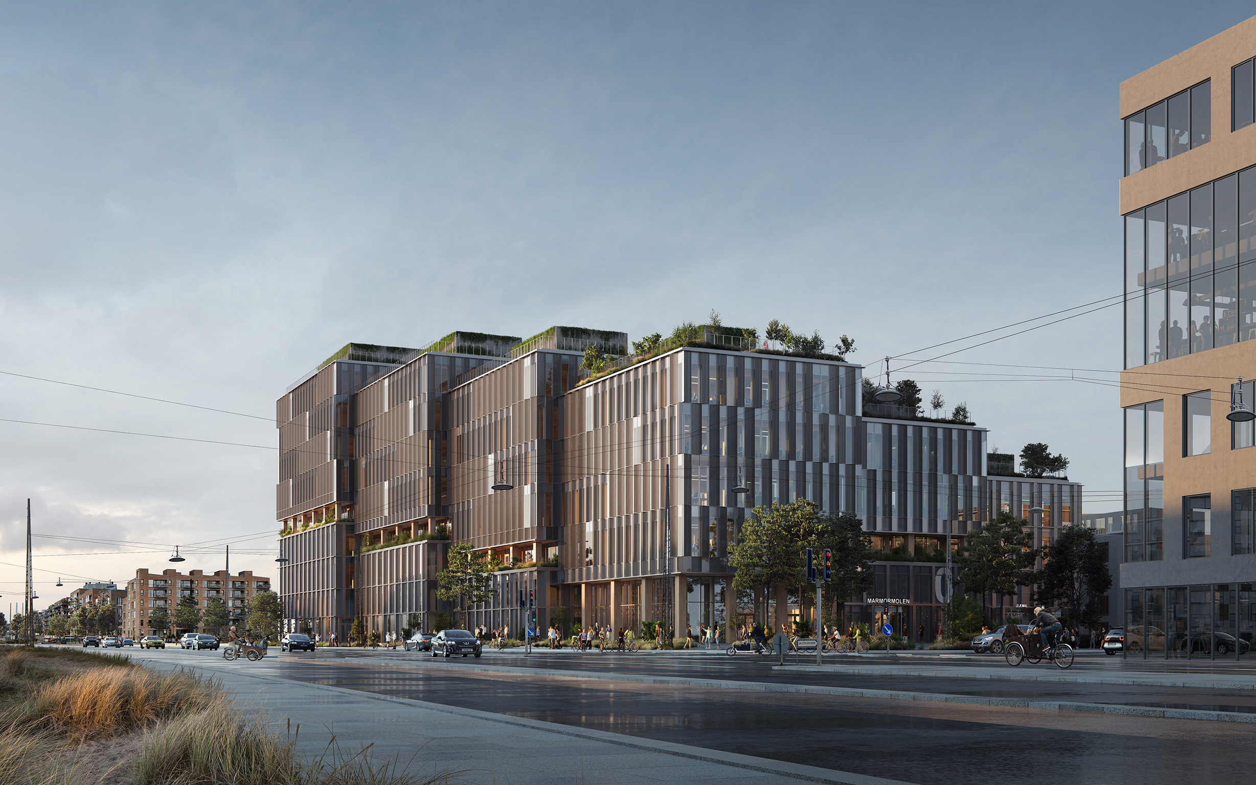 Marmormolen er et 28.000 m2 erhvervsbyggeri, der opføres med CLT-træ i de bærende konstruktioner. Bygningen bliver 36 meter højt i otte etager.