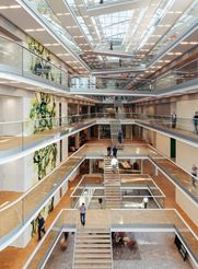 Over husets centrale atrium er der et 1.200 m² stort ovenlys med et spænd på 11 m. Søjle- og bjælkekonstruktionen er med stabiliserende kerner i efterspændte betonelementer.
