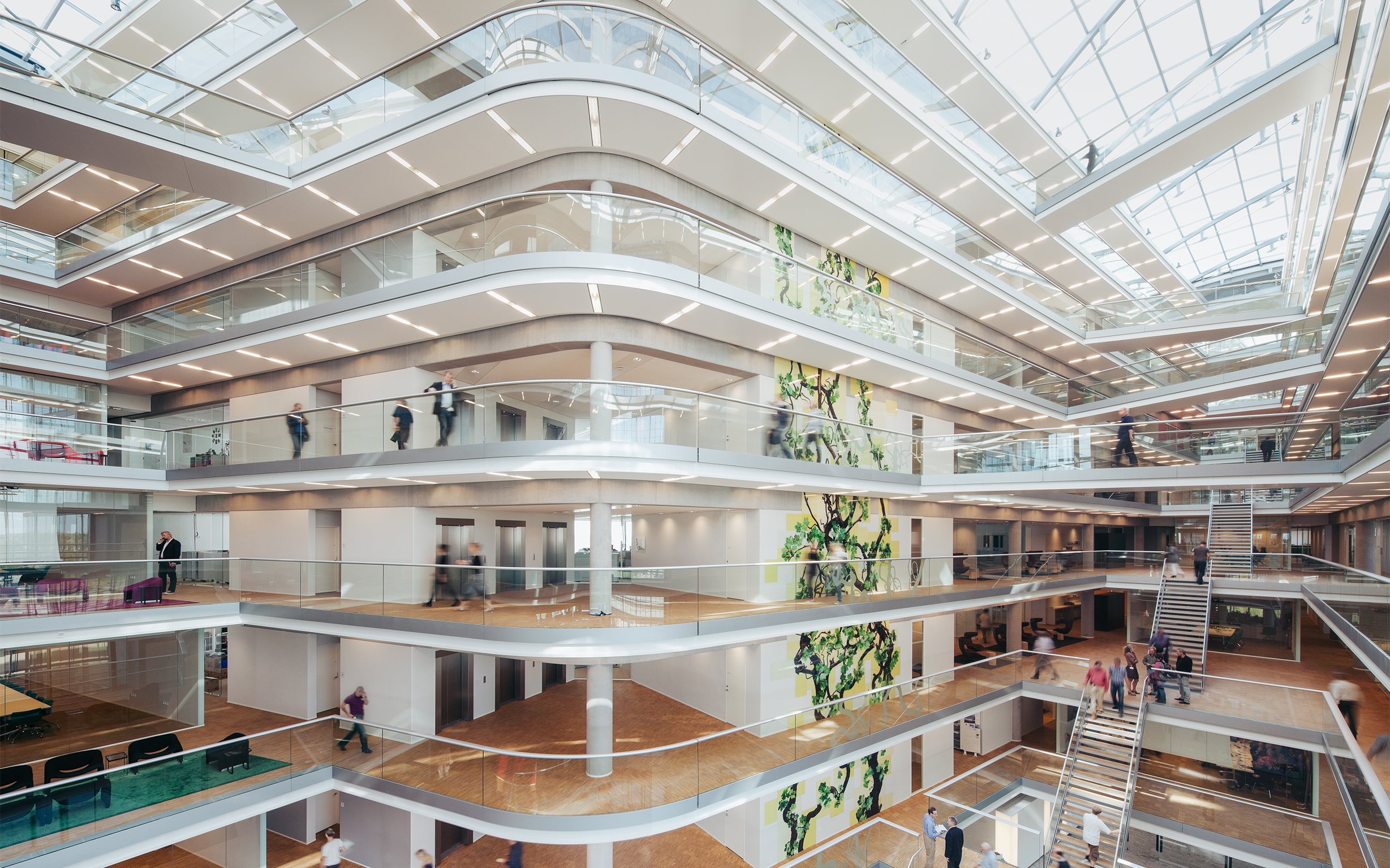 Hovedkontoret er indrettet med et centralt atrium, 1.200 m2 ovenlys og glas-alu facader